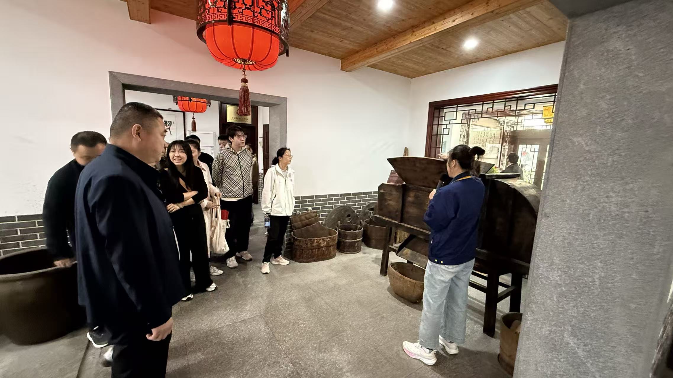 走進玉祁酒業,古色古香的釀酒作坊與現代化生產車間交相輝映,空氣中彌漫著醇厚的酒香。在企業工作人員的帶領下,黨員們先后參觀了雙套酒釀造技藝展示館、企業展覽館、釀造車間、江南醬香酒體品鑒中心等場所。從明清時期的釀酒器具、古早的酒標標識,到如今的非遺釀造技藝展示,一幅幅珍貴的歷史圖景、一個個生動的生產場景,全方位展現了玉祁酒業百年的傳承與發展。
