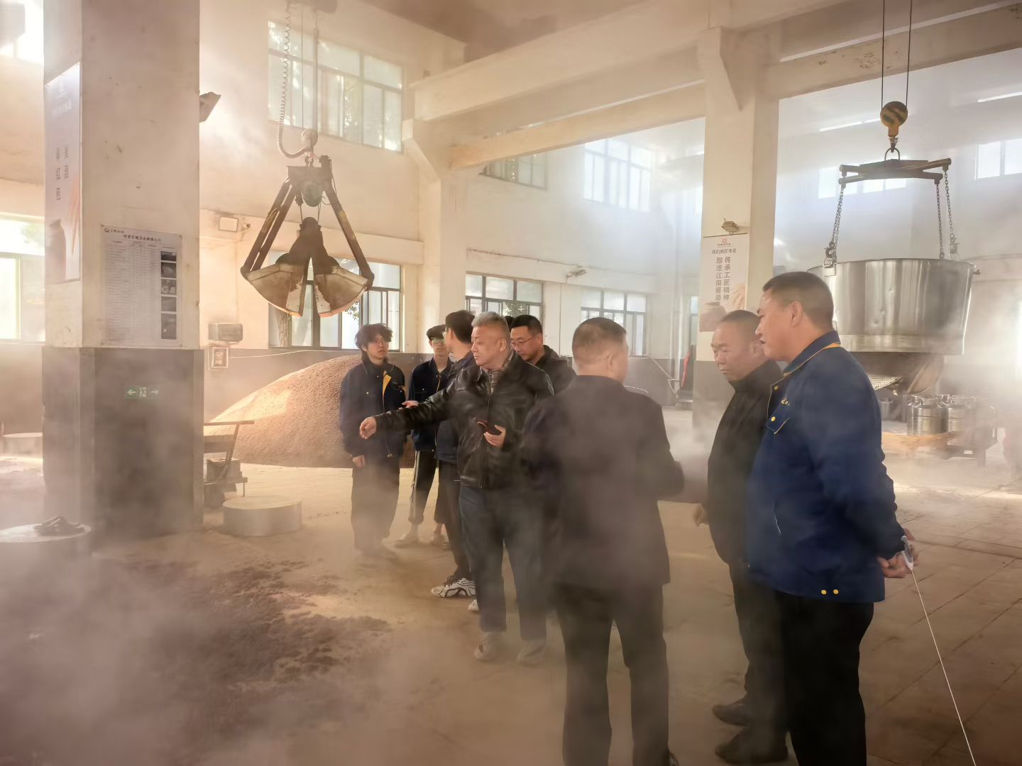 清晨的玉祁酒業釀造車間,蒸汽氤氳間彌漫著醇厚的糧香與曲香。王昭亮主任與徐巖教授團隊直奔生產現場,沿著 “12987” 大曲坤沙工藝的關鍵環節,從酒醅攤涼、堆積發酵到入窖密封,逐一細致考察。作為堅守 “端午制曲、重陽下沙” 傳統的江南醬酒,其一年生產周期、兩次投料、九次蒸煮、八次發酵、七次取酒的復雜工藝,與王昭亮主任深耕的茅臺核心工藝一脈相承。